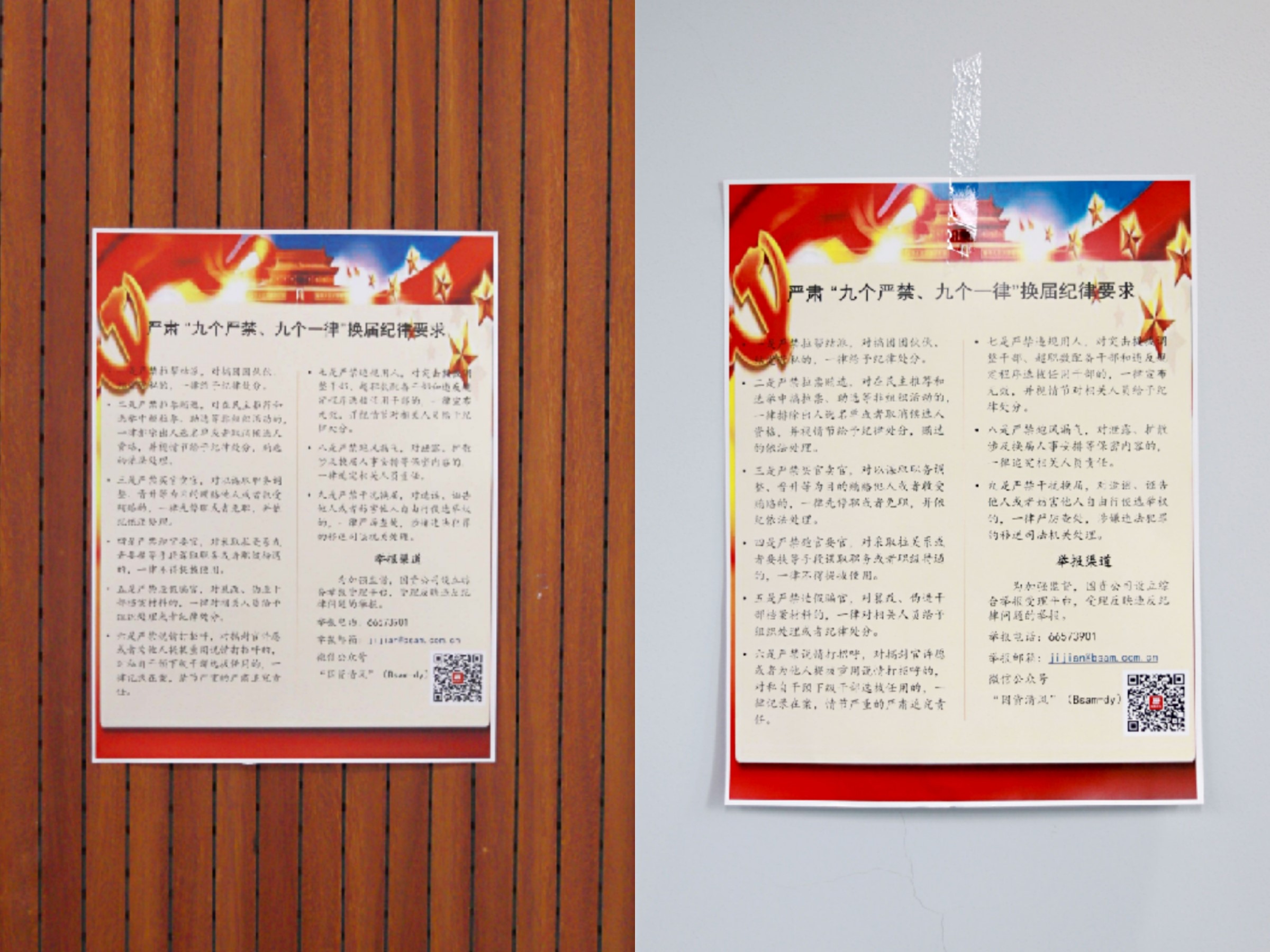 大會籌備階段,誠和敬公司紀委印發(fā)《關于進一步嚴明換屆紀律要求的通知》,并于黨建公眾號推送換屆紀律提示卡,打好換屆紀律“預防針”。大會前夕分別在主會場及各小組分會場張貼“九個嚴禁、九個一律”換屆紀律提醒海報共8張,警示督促全體黨員嚴肅認真行使選舉權利。