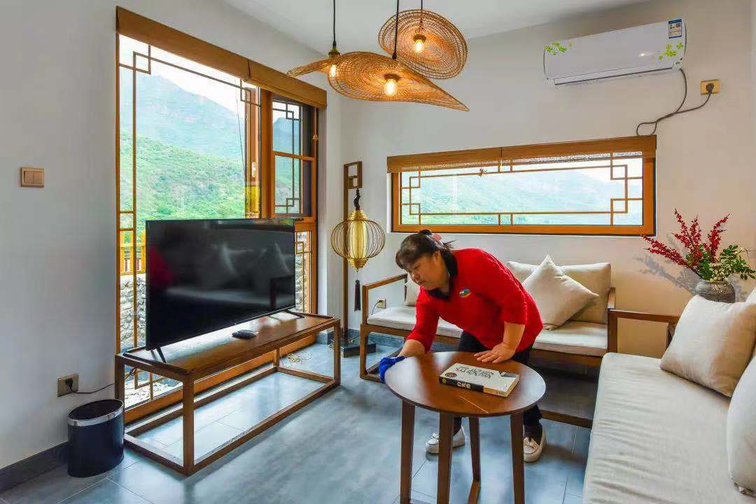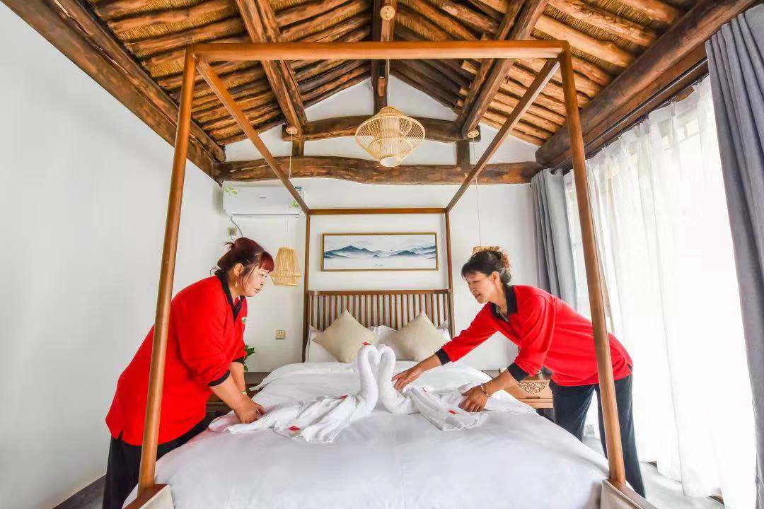 剛才提到的孫大姐,現(xiàn)在如愿地有了穩(wěn)定的工作——創(chuàng)藝鄉(xiāng)居精品民宿管家,經(jīng)過培訓(xùn),她已經(jīng)可以在5分鐘內(nèi)換好床單、被罩、枕芯所有床品,還會(huì)把毛巾疊出栩栩如生的小動(dòng)物。她說,以前總覺得自己低人一頭,現(xiàn)在有了穩(wěn)定工作送到咱家門口,有了份工作,收入不僅翻了倍,而且活的更有價(jià)值和尊嚴(yán)了。