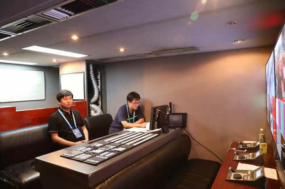 最終播放前,水晶石視頻制作負(fù)責(zé)人在轉(zhuǎn)播車內(nèi)審片
