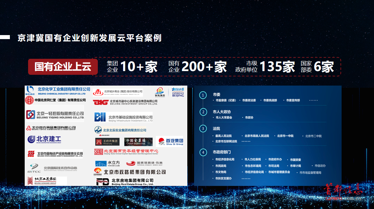 京津冀國有企業(yè)創(chuàng)新發(fā)展云平臺(tái)案例:首都信息作為市國資委支持的“京津冀國有企業(yè)創(chuàng)新發(fā)展云平臺(tái)”云服務(wù)商,積極為市屬國資國企提供安全可信云基礎(chǔ)設(shè)施及私有云解決方案,為企業(yè)提供在線管控(“三重一大”決策與運(yùn)行監(jiān)管、大額資金動(dòng)態(tài)管控等)、數(shù)字化運(yùn)營(業(yè)財(cái)一體化平臺(tái)等)、協(xié)同服務(wù)(融媒體、營銷、移動(dòng)平臺(tái)等)等數(shù)字化平臺(tái)解決方案,取得較好應(yīng)用效果。