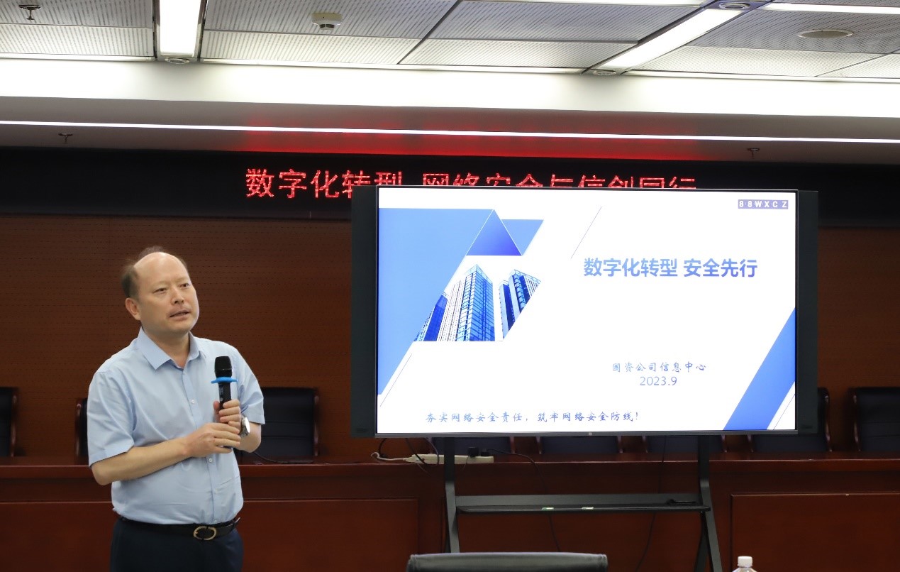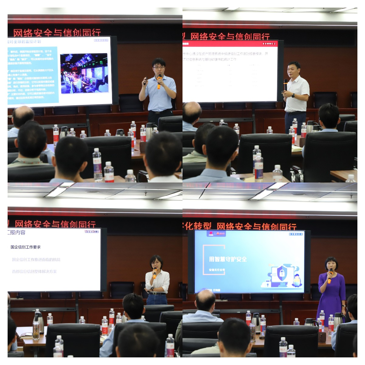 此次活動(dòng)以“數(shù)字化轉(zhuǎn)型 網(wǎng)絡(luò)安全與信創(chuàng)同行”為主題,邀請(qǐng)國(guó)資公司綜合管理部(信息中心)和安信天行公司、首信云公司相關(guān)人員分別以《數(shù)字化轉(zhuǎn)型 安全先行》《用智慧守護(hù)安全》《信創(chuàng)工作分享》《國(guó)有企業(yè)信創(chuàng)通用解決方案》為題交流發(fā)言,重點(diǎn)圍繞網(wǎng)絡(luò)安全的國(guó)際形勢(shì)和國(guó)家政策、國(guó)資公司防護(hù)機(jī)制、日常安全威脅、信創(chuàng)工作部署及對(duì)外提供的信創(chuàng)解決方案等內(nèi)容進(jìn)行分享。