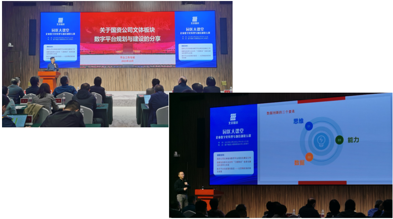 本次培訓仍以內部分享交流為主,分享了國資公司數(shù)字化轉型的三個實際案例。國資公司文體板塊數(shù)字平臺建設工作專班的兩位成員:國資公司文體產業(yè)投資部高級項目經理鄭翼程、首信公司大數(shù)據(jù)中心總經理萬聰以“關于國資公司文體板塊數(shù)字平臺規(guī)劃與建設的分享”為主題,介紹了文體板塊落實公司“數(shù)字化營銷、集團化作戰(zhàn)、品牌化運作”的理念和要求,推進文體板塊數(shù)字平臺建設的必要性、搭建構想及工作進展。