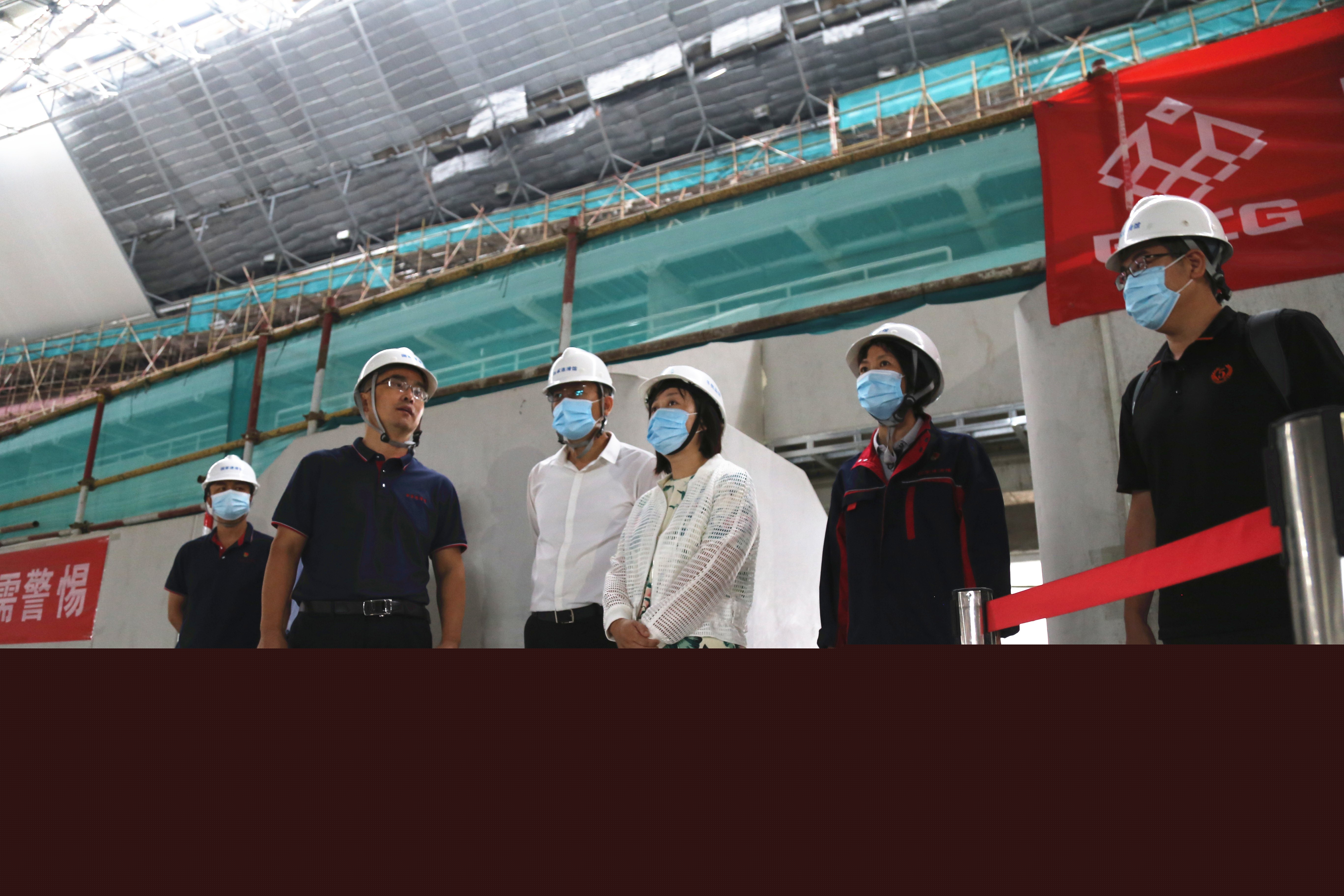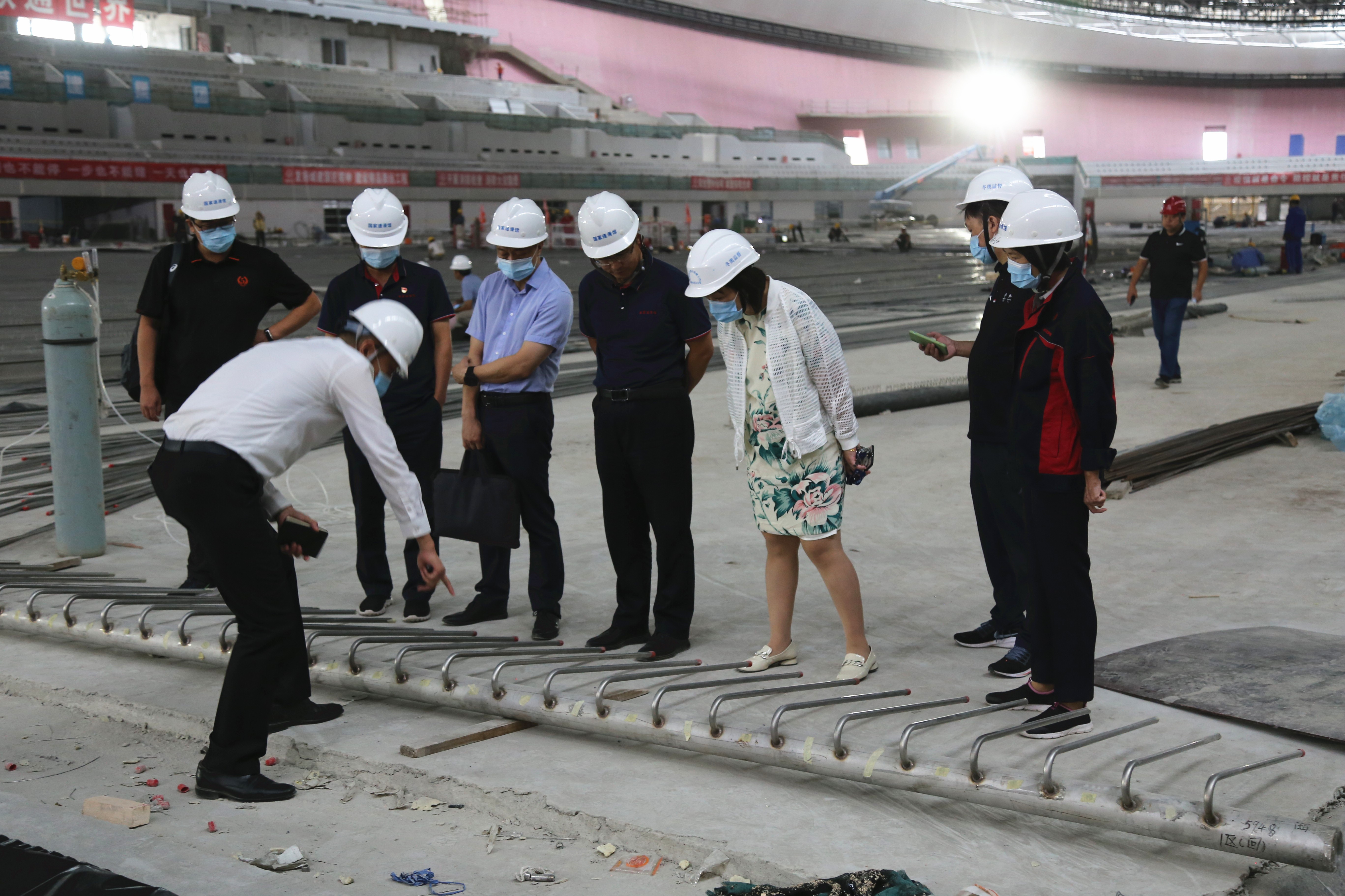 調研檢查組首先查看了工程形象進度,檢查了制冰工藝施工現(xiàn)場,了解了“百日會戰(zhàn)”的階段性成果和場館總體施工進展情況。