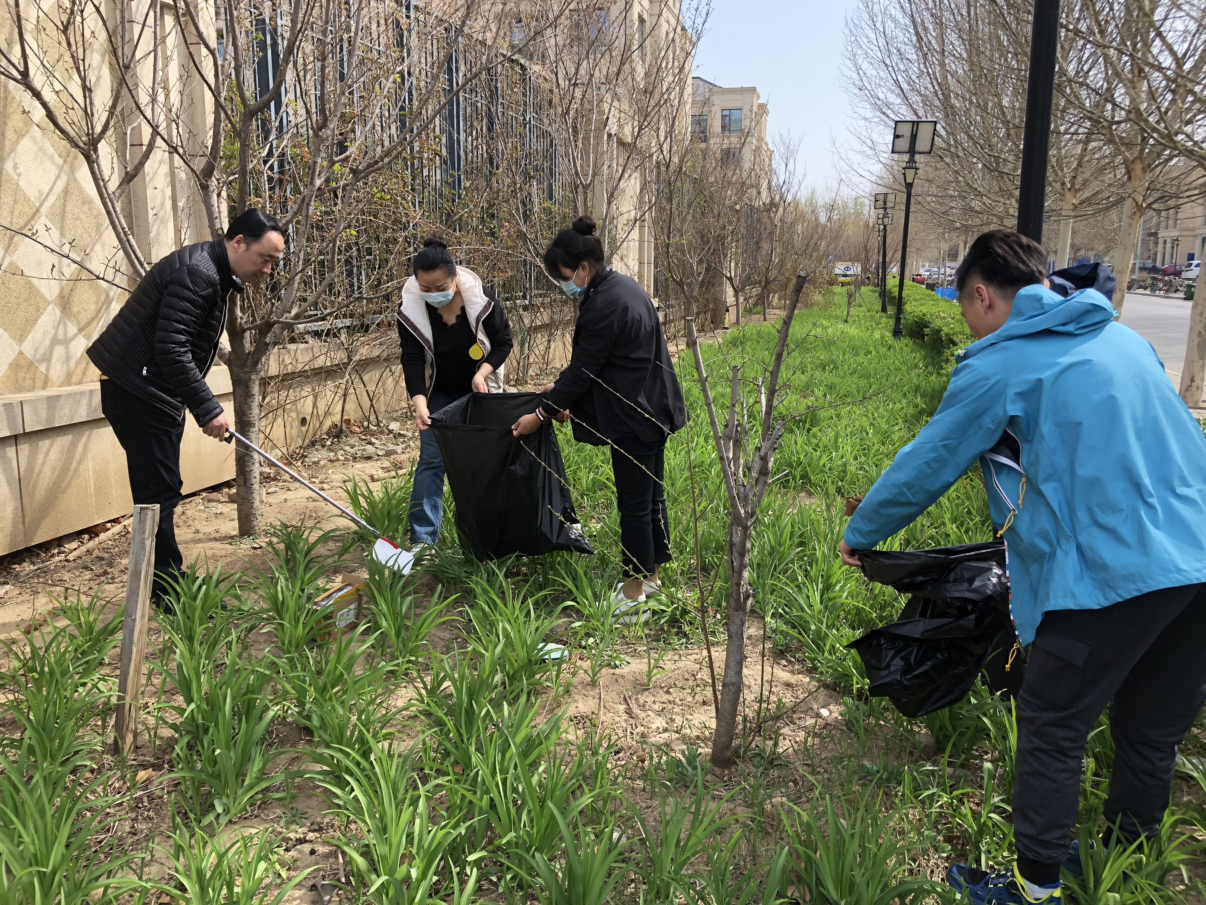北科建集團所屬北京城市公司翡翠山項目部全體黨員清理翡翠山小區(qū)及周邊道路綠化帶內(nèi)的垃圾
