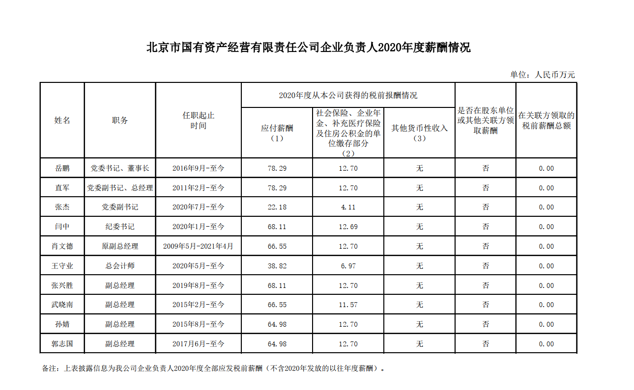 北京國資公司2020年度企業(yè)負責人薪酬信息公開