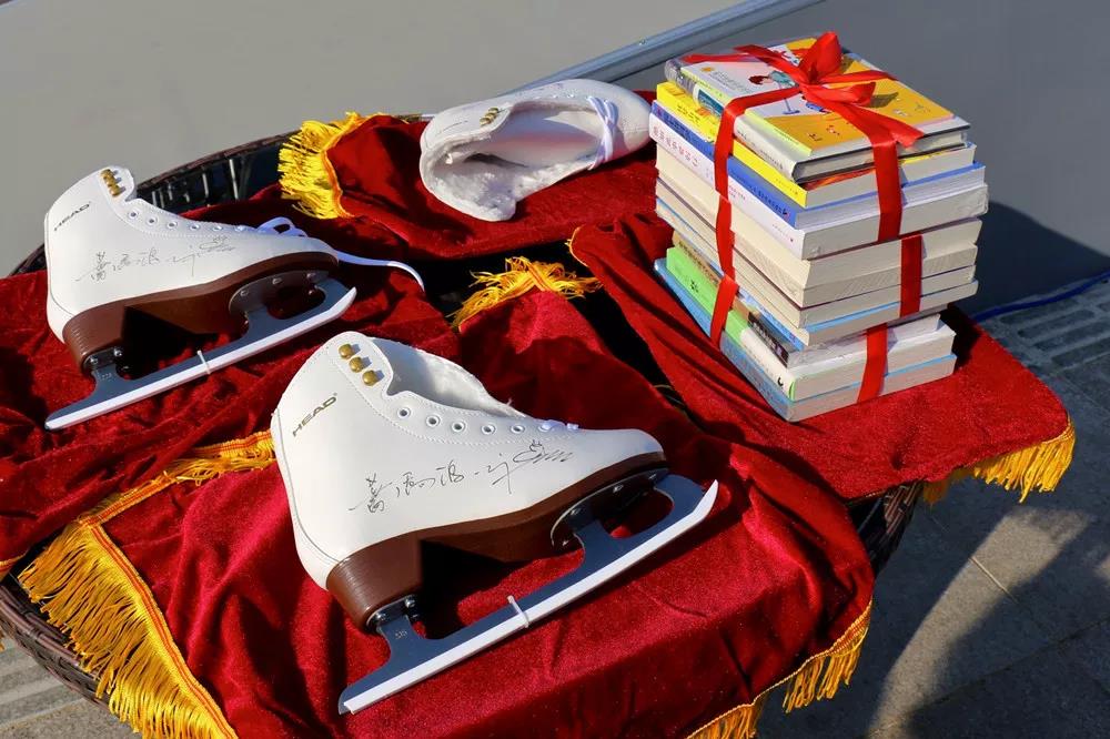 在“攜手未來(lái) 圓夢(mèng)冰雪”公益活動(dòng)啟動(dòng)儀式上,北京國(guó)資公司副總裁兼北奧集團(tuán)董事長(zhǎng)肖文德、北京市婦聯(lián)社會(huì)工作部部長(zhǎng)李雪松、北奧集團(tuán)總經(jīng)理金延、國(guó)家游泳中心總經(jīng)理?xiàng)钇嬗?、?guó)家體育場(chǎng)黨委副書記杜詩(shī)文、北京北發(fā)公司總經(jīng)理年小雷向來(lái)自低收入村的優(yōu)秀學(xué)生代表贈(zèng)送葉喬波簽名冰鞋和王冰玉簽名冬奧書籍套裝。