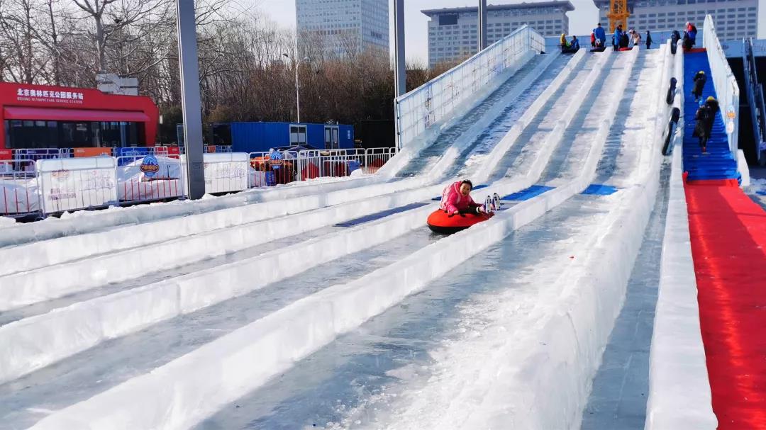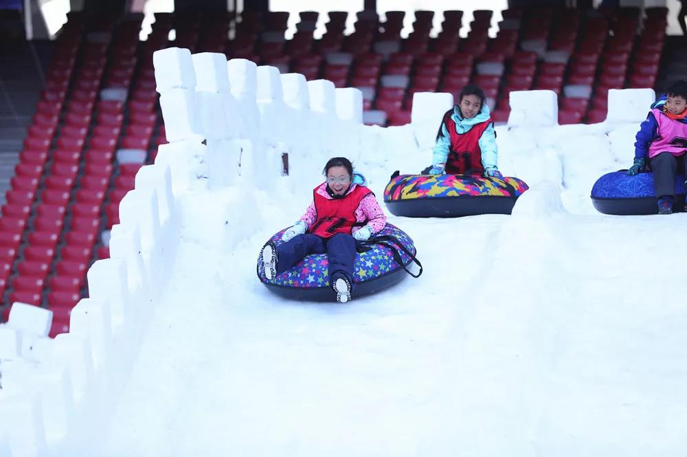 孩子們?cè)趹c典廣場(chǎng)體驗(yàn)飛天大滑道和冰爬犁帶來(lái)的樂(lè)趣;